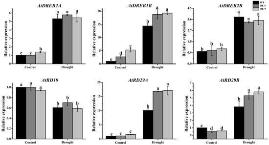 Effects of water deficit on the transcription changes of multiple drought responsive genes in Arabidopsis TaTIP4;1 overexpressors. Fifteen-day-old WT, VC and TaTIP4;1 transgenic plants were dehydrated for 6 h. Gene expression was detected by quantitative real-time RT-PCR (qRT-PCR) method, AtActin2 was used as the internal control. Data are mean ± SD (n ≥ 3). Diverse lowercase letters above the error bars show significant differences in the values among the plants by one way ANOVA and Tukey’s HSD test (p < 0.05).