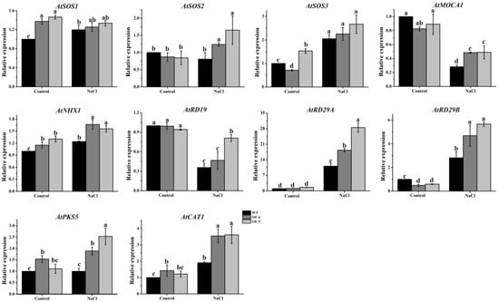 Effects of NaCl on the expression patterns of multiple salt responsive genes in Arabidopsis transgenic plants overexpressing TaTIP4;1. Fifteen-day-old WT, OE6 and OE9 seedlings were treated with or without 200 mM NaCl for 6 h. Gene expression was evaluated by qRT-PCR method, AtActin2 was used as the internal control. Values are mean ± SD (n ≥ 3). Diverse lowercase letters above the error bars reveal remarkable differences in the values among the seedlings by one way ANOVA and Tukey’s HSD test (p < 0.05).