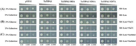 The protein structure of TaTIP4;1 was predicted using the online software (https://services.healthtech.dtu.dk/service.php?TMHMM-2.0, accessed on 26 December 2021). TaTIP4;1 is a six transmembrane protein. Three potential phosphorylation sites (S83, S201 and S201) in the cytoplasmic region were selected for further analysis. The TaTIP4;1 CDS and the CDS with mutated nucleotides (the 247th, 602th, 619th) were amplified, and cloned into yeast expression vector pYES2 driven by a GAL1 promoter, respectively. The constructs were introduced into yeast strain INVSC1 (His-, Leu-, Trp-, and Ura-) following the standard lithium acetate method [36]. For salt stress, the yeast cells were cultured in 5 M NaCl for 24 h at 30 °C with shaking. For sorbitol stress, the yeast cells were cultured in 2 M sorbitol for 24 h at 30 °C with shaking. Then, the yeasts were grown on selective solid plates containing 50 mM NaCl or 200 mM sorbitol at 30 °C for 3 days [37].