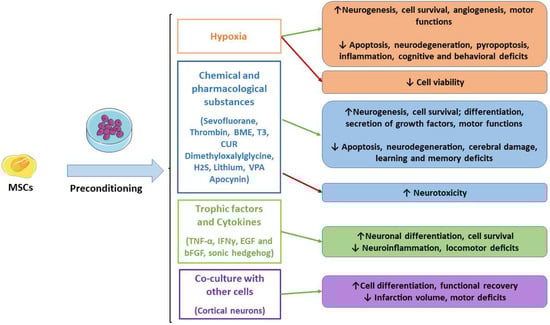 Wang et al., to understand the effects of hypoxic preconditioning, performed a study on global cerebral ischemia rats administered intravenously with hypoxic preconditioned MSCs. The results of the study reported that MSCs transplantation promoted the increase in migration and cell survival as well as led to the reduction in neuronal apoptosis and inflammation in the cerebral cortex compared to the groups administered with MSCs cultured with normal O2 levels. Additionally, it was shown that hypoxic preconditioning promoted the migration and proliferation of MSCs through the involvement of signaling molecules, including HIF-1α, CXCR4 and PI3K/AKT [].
