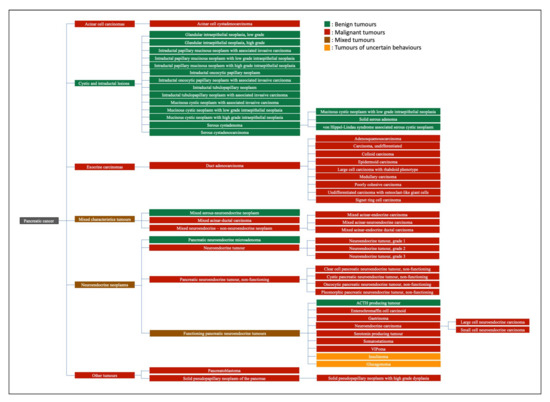 Pancreatic cancer (PanC) is an aggressive malignancy of the digestive and endocrine system that develops in the head of the pancreas most commonly, as well as in the tail and body of the organ [1]. The majority of PanC arises from exocrine glands of the pancreas, in which pancreatic ductal adenocarcinoma (PDAC) is the most common type, while the less common pancreatic tumours are of the endocrine type (e.g., pancreatic neuroendocrine tumour (PNET) [2] (Figure 1)).