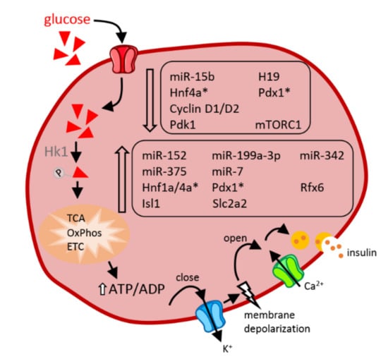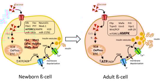 The laboratories of Claes Wollheim, Guy Rutter, Frédéric Lemaire and Franz Schuit, among others, made major contributions in identifying a pool of so-called “disallowed genes” that need to be silenced to achieve a fully functional β-cell. Several of these transcripts are expressed at a high level in β-cells of newborn rodents and humans [,]. Elevated levels of the lactate dehydrogenase (LDHA) and the monocarboxylate transporter 1 (MCT-1) specifically affect glucose-induced insulin secretion []. Indeed, in β-cells, the increase of these proteins interferes in the coupling of the glycolytic flow with mitochondrial oxidative phosphorylation [,]. In β-cells, the expression of MCT-1 allows pyruvate and lactate produced by muscles during exercise to trigger oxidative phosphorylation, resulting in an inappropriate rise in insulin secretion []. The gene coding for MCT-1, solute carrier family 16 member 1 (SLC16A1), is strongly repressed in adult β-cells of healthy subjects and individuals with high levels of MCT-1 suffer from exercise-induced hypoglycemia []. Neonatal β-cells do not show a predominant glycolytic flux on oxidative metabolism (Crabtree effect) [], nor a glycolytic overproduction of lactate in anaerobic conditions (Pasteur effect) []. The silencing of genes such as Ldha and Hexokinase 1 (Hk1) during β-cell maturation is driven by the methylation pattern of their loci controlled by the DNA methyltransferase DNMT3A []. The microRNA miR-29 appears also to play an important role in the control of postnatal β-cell maturation by repressing different disallowed genes and by inhibiting, among others, the expression of Mct-1, Pdgfra (platelet derived growth factor receptor alpha), and Rest (RE1 silencing transcription factor) [,,,]. The level of this microRNA is higher in rat islets after weaning. Indeed, the expression of miR-29 and of several other microRNAs seems to be strongly affected by the switch to a carbohydrate-rich diet induced by weaning [].