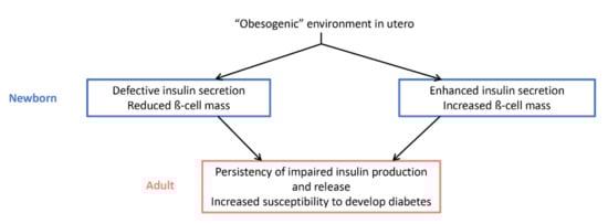 Analysis of the metabolic phenotype of children born during the famine periods of the 20th century revealed that individuals exposed to undernutrition during fetal life have a higher risk of developing metabolic diseases in adulthood, including T2DM []. Children born from mothers with energy deficiency during pregnancy have reduced birth weight, impaired insulin secretion at adulthood, and a predisposition to develop glucose intolerance. These disorders are accentuated when these same individuals develop obesity []. Murine models have been used to decipher the mechanisms underlying these metabolic disturbances (Figure 3).