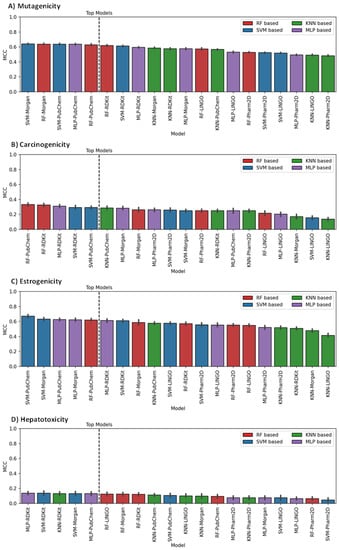 Evaluation results, expressed in terms of MCC, obtained for all different models developed for the (A) mutagenicity, (B) carcinogenicity, (C) estrogenicity and (D) hepatotoxicity endpoints. The 5 top-scored models for each endpoint are separated from the others by a black dashed line.