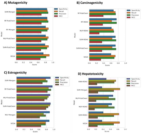 The results obtained for the mutagenicity endpoint (Figure 2A), show that all of the selected models performed better than VEGA in terms of MCC. In particular, the model based on the RF algorithm combined with PubChem FPs, as well as that combining SVM with Morgan FPs, was found to be the best performing ones, performing equally and achieving the highest MCC, Precision and Specificity scores. Interestingly, the three remaining models, which achieved slightly lower MCC values, were found to perform better in Recall, with a score of 0.88. Nevertheless, all of our models were slightly inferior to VEGA in terms of Recall (0.90).