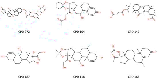 In order to obtain a deeper insight into the improvement in prediction reliability obtained using the consensus approach with respect to the single reference models included in VEGA, we analyzed the results of the test set predictions obtained for all four endpoints in order to check the structures of the compounds misclassified by VEGA and correctly classified by our strategy. The most interesting results were identified among the hepatotoxicity predictions. The reference hepatotoxicity model included in VEGA generated 60 false-positive predictions, i.e., non-hepatotoxic compounds that were predicted as toxic, while 38 of these compounds (63%) were correctly classified by our consensus strategy combining the top 5 models herein developed (see Section 3.3). Interestingly, a cluster of 6 compounds sharing a common steroid structure was identified among these 38 molecules (Figure 4).