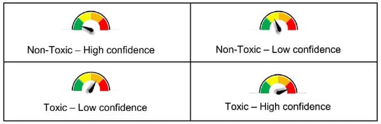 With the aim of creating a freely accessible platform for multiple toxicity predictions, we developed the web tool VenomPred, available on the following page of our research group’s website http://www.mmvsl.it/wp/venompred/. VenomPred allows toxicological predictions of potential mutagenicity, carcinogenicity, estrogenicity and hepatotoxicity of small molecules employing the best performing models herein developed for each endpoint by following the consensus approach. In particular, for each endpoint, the consensus strategy that showed the best results was implemented in our web tool. VenomPred presents an intuitive and user-friendly interface. The users only need to provide the SMILES (Simplified Molecular-Input Line-Entry System) strings of the compounds to be evaluated, which can be obtained by simply drawing the molecular structures on the integrated 2D sketcher [32]. In order to complete the request, it is necessary to select at least one of the four endpoints available; after the request is submitted, the web tool computes the consensus toxicity prediction for each endpoint. A report providing the results for each analyzed molecule is then sent by email. The report includes a “Probability” value related to each toxicity prediction requested, which corresponds to the value of the consensus score expressed as a percentage. In order to facilitate the interpretation of results, VenomPred report also includes a graphical representation related to the confidence level of each prediction, derived from the Probability value, which is divided into four different ranges: (a) Probability < 25%, (b) 25% ≤ Probability < 50%, (c) 50% ≤ Probability < 75% and (d) 75% ≤ Probability. The first two ranges, a and b, respectively, indicate a high and low confidence level in the prediction of a molecule as harmless, while ranges c and d indicate a low and high level of confidence, respectively, for a prediction of toxicity. The four different Probability ranges a, b, c and d were then, respectively, color-coded as green, yellow, orange and red sections of the graphical indicator associated with each prediction within the VenomPred report (Figure 5).