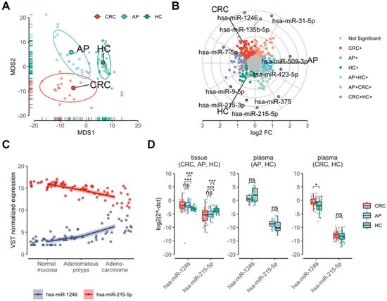 Expression profiling of miRNAs in precancerous and cancerous tissues of the colon. (A) MDS plot showing three clearly resolved clusters corresponding to colorectal cancer (CRC) and adenomatous polyps (AP) patients and healthy controls (HC). The analysis was performed on normalized miRNA count data using Euclidean distance. (B) A radar plot showing commonly and uniquely deregulated miRNAs (PFDR < 0.01 and |log2FC| > 0.5) among CRC, AP, and HC groups (indicated by colors) in small RNA-seq data. (C) miRNAs highly correlating (absolute value of rSpearman’s > 0.7) with the stages of healthy to adenoma-carcinoma sequence. Spearman’s rank correlation analysis was performed on variance stabilizing transformed miRNA counts. (D) The boxplots display expression levels (delta Ct) of hsa-miR-1246 and hsa-miR-215-5p measured by RT-qPCR in tissue and plasma samples of an independent validation cohort of HC, AP, and CRC individuals. Dots located along the box plots indicate miRNA expression level of each individual in the validation group. Due to the use of different RT-qPCR assays, the results of AP and CRC plasma samples are displayed separately. The ΔCt values were inversed in order to show true direction of the expression. Significance levels: * PFDR < 0.05; *** PFDR < 0.001; ns—not significant.