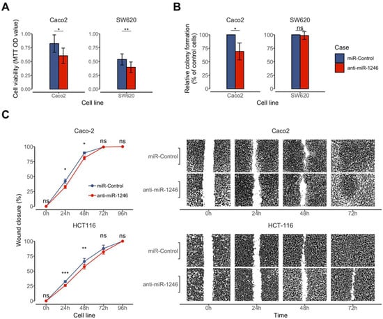 Effect of hsa-miR-1246 inhibition on cell viability, colony formation, and migration of Caco-2, HCT116, and SW620 cells. Inhibitor anti-miR-1246: (A) reduced cell viability in Caco-2 and SW620 cells; (B) reduced colony formation ability in Caco-2 cells; (C) lowered cell migration rates in Caco-2 and HCT116 cells 24 h and 48 h after transfection. Image magnification is ×20. Data are presented as the mean ± standard deviation (SD) of three independent experiments. Significance levels: * PFDR < 0.05; ** PFDR < 0.01; *** PFDR < 0.001; ns—not significant. Since wounds were fully closed after 96 h, images representing this time point were not included in the figure.