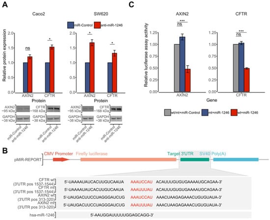 hsa-miR-1246 suppresses expression of CFTR and AXIN2 via direct 3’UTR targeting. (A) Effect of hsa-miR-1246 inhibition on CFTR and AXIN2 protein expression compared with negative control (miR-Control) measured at 72 h after transfection of Caco-2 and SW620 cells. Protein bands representing the signals detected by Western blot are provided at the bottom of the panel. Protein expression was normalized to the expression values of GAPDH reference protein. Data from three to four independent experiments presented as the mean of relative protein expression ± standard deviation (SD). (B) Representation of constructed pMIR-REPORT vectors containing wild type (wt) and mutant type (mt) 3’UTR sequences of AXIN2 and CFTR genes, which are within the predicted binding sites of hsa-miR-1246. (C) Downregulation of AXIN2 and CFTR by hsa-miR-1246 mimics. Luciferase activity of cells transfected with negative controls (miR-Control) was used as a normalization factor and was set at 100%. Data are presented as the mean ± SD of three independent experiments. Luciferase activity significantly decreased in co-transfection with hsa-miR-1246 mimic and wild-type 3’-UTR-luciferase plasmid of both CFTR and AXIN2 target genes after 72 h Significance levels: * PFDR < 0.05; *** PFDR < 0.001; ns—not significant.