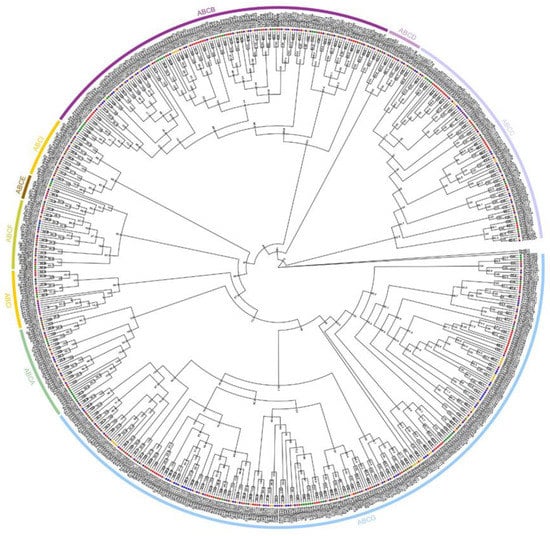 ABC transporter proteins are a group of transmembrane transport proteins commonly found in prokaryotes and eukaryotes that have a large and diverse range of functions. In plants, ABC transporter proteins are involved in maintaining cellular osmotic homeostasis, toxin enrichment and efflux and stomatal movement in response to various stresses and are essential for normal seed germination and lateral root development [,]. Phylogenetic trees were constructed using 118 ABCs of Arabidopsis, 126 of rice, 133 of sorghum, 172 of poplar, and 133 of maize (Figure 1). The results showed the 682 ABC genes from the five species scattered in each branch, indicating that the ABC gene family amplification event predates the differentiation of plant monodic types.