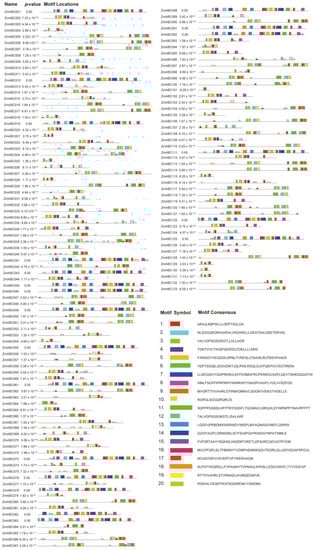 The conserved motifs of ZmABC proteins were analyzed using Multiple Em for Motif Elucidation (http://meme-suite.org/index.html (accessed on 23 November 2021)). The maximum number of motifs to be identified was set to 20. In addition, every sequence that occurred at least once was used [].