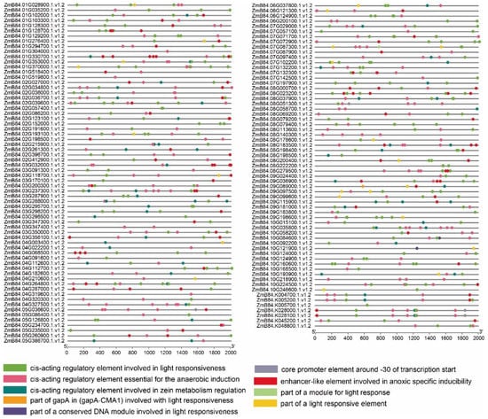 To better understand the function of maize ABC family genes, we analyzed the cis-acting elements in the 2000 bp promoter region of each gene (Figure 3). In addition to the essential cis-acting elements related to transcription and light response, three classes of cis-acting elements were identified. We found elements involved in stress responses, mainly including light responses, anaerobic sensing and regulation of protein metabolism. These results indicate that maize ABC genes play an important role in both plant growth and development as well as in adversity stress.