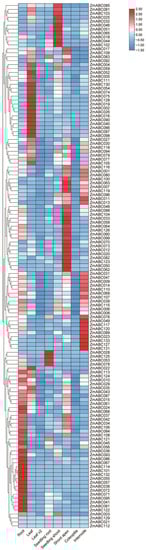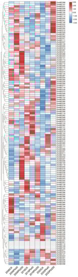 To further understand the spatial expression patterns of maize ABC family genes, we used information archived in the transcriptome database of the HMMER 3.3.2 website. We analyzed the ABC family genes in eight different tissues and developmental stages of maize cultivar B84 (root, leaf, leaf v2, seedling root, seedling shoot, shoot apex, coleoptile and internode). As shown in Figure 4, 133 ABC genes were expressed in most of the eight different developmental stages. ZmABC129, 021 and 112 were expressed at the same level in all eight sites, indicating that the functions of these three genes may be the same at different sites. Most of the ZmABC genes were constitutively expressed and were expressed at all eight sites. No genes were highly expressed in leaf v2. These results indicate that ABC family genes are involved in regulating different developmental processes of maize.