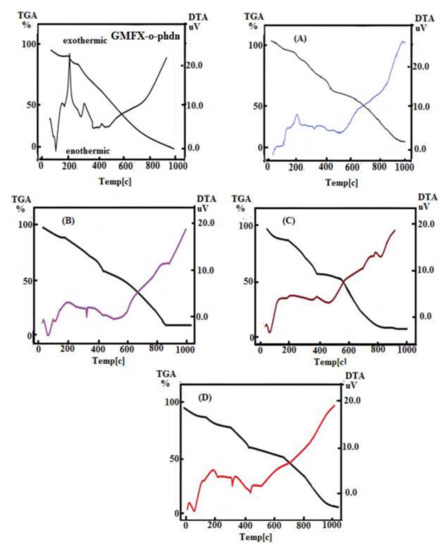 According to the prior DTA survey, the DTA nitrogen thermogram of GMFX-o-phdn with metal complexes under study offers several phases, as shown in Figure 1. In the DTA curves, the chemical modifications that follow the removal of water, anion, and ligand molecules are spotted as exo- or endothermic peaks. At 88, 189, 282, and 439 °C, the GMFX-o-phdn offers these four peaks. The peaks 88, 282, and 439 °C are endothermic peaks with −4.77, −0.35, and −0.55 μV, respectively, except 189 °C is exothermic peak with 11.01 μV with this activation energy. The (A) complex has severalpeaks (endothermic and exothermic) of 1.20, 2.51, and −0.63 μV activation energies at different temperatures of 137, 203, and 328 °C respectively. The complex (B) manifested three peaks at 72, 119, and 329 °C for A. Evaporation of absorbed water is imputed to the first and second peaks and well-defined as endothermic peaks at 72 and 119 °C and activation energy of −3.24 μV and −0.99 μV. At 329 °C, the third peak reflects −1.39 μV of decomposition and activation energy. DTA curve of (C) complex manifests two peaks at 67 and 395 °C. The first endothermic peak with activation energy of −3.84 μV at 67 °C matched to lack of water molecules hydration and the last peak at 395 °C matched to the abstraction of coordinated water and GMFX-o-phdn molecules with activation energy of −0.53 μV. Finally, DTA curve of (D) complex presented four peaks at 80, 197, 331, and 448 °C. The first endothermic peak with activation energy of −4.36 μV at 80 °C matched to lack of water molecules hydration and the last three peaks at 197, 331, and 448 °C matched to the abstraction of coordinated water and Schiff base GMFX-o-phdn molecules with activation energies of 1.50, −1.92, and −1.49 μV.