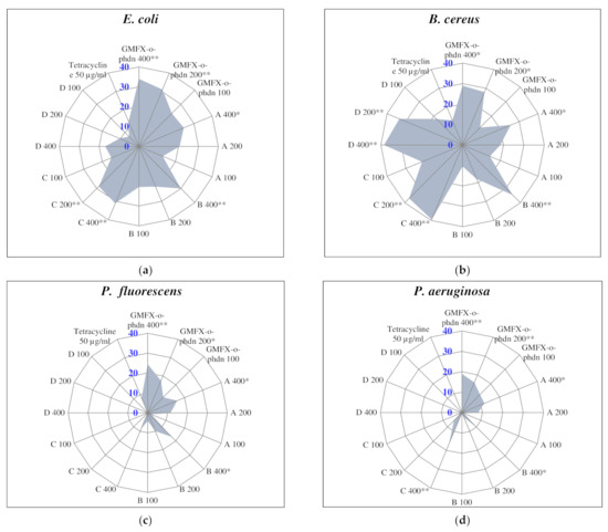 Regarding the antibacterial activity of the studied GMFX-o-phdn and its metal complexes, the obtained results showed that all tested treatments were able to inhibit the growth of tested pathogenic bacteria especially at the higher tested concentration (400 µg/mL) compared to the positive control tetracycline (50 µg/mL) as illustrated in Figure (2). In particular, the parent ligand showed the highest significant activity against E.coli, P. fluorescens, and P. aeruginosa where the diameters of inhibition zones were measured as 34.0, 24.5, and 19.0 mm, respectively. (C) complex showed the highest significant activity against E. coli (31.0 mm), whereas (C) and (D) complexes showed the highest significant activity against B. cereus (39.5 and 38.5 mm, respectively) compared to all other treatments (Figure 2).