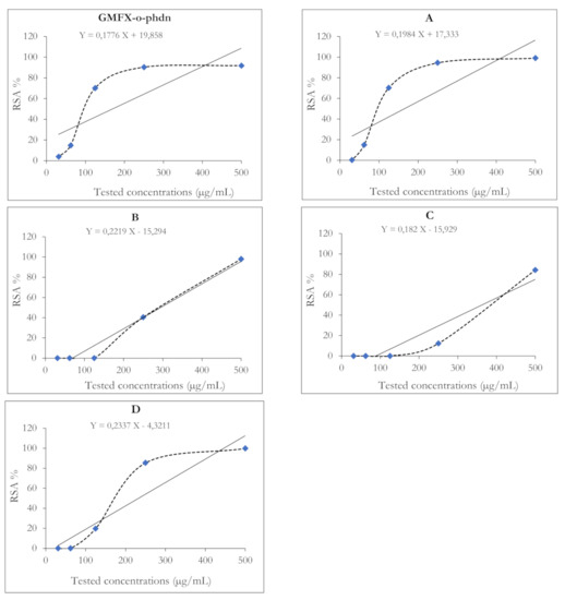 The radical scavenging activity (RSA%) of the studied GMFX-o-phdn and its metal complexes using ABTS method. Where IC50 was calculated following the trend line equation equal to: <1, 437, 548, 472, and 673 µg/mL for GMFX-o-phdn, (A) Fe, (B) Zn, (C) Zr, and (D) Co, respectively.