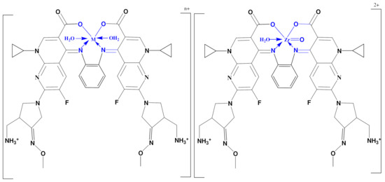 The crystal structures of several free fluoroquinolones molecules have been determined in several research [1,2,3]. It is interesting to note that in most cases the carboxylic group is not deprotonated and the hydrogen atom of this group is hydrogen bonded to an adjacent 4-oxo atom. In few examples such as gemifloxacin, lomefloxacin, norfloxacin, moxifloxacin, and ciprofloxacin, the carboxylic group is protonated and the molecules exist in a zwitterionic form with protonated terminal nitrogen of the piperazine ring in a solid state [4,5,6]. Crystal structures of fluoroquinolones complexes indicate that neutral fluoroquinolones in the zwitterionic state are capable of forming simple complexes bidentately through one of the carboxylic oxygen and ring carbonyl oxygen [7,8,9,10].
