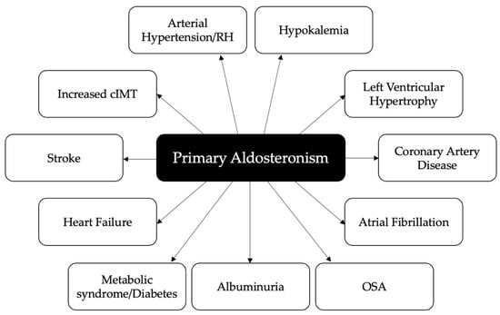 Cardiovascular, cerebrovascular, metabolic and renal complications associated with primary aldosteronism. RH: resistant hypertension; cIMT: carotid intima-media thickness; OSA: obstructive sleep apnea.