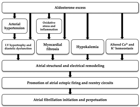 As regards to the potential physiopathological mechanism linking aldosterone excess to FA, aldosterone is thought to be involved in the genesis and perpetuation of AF not only by causing AH and electrolyte imbalance, but also by inducing inflammation, oxidative stress, fibrosis and electrophysiological changes; all these mechanisms contribute to structural and electrical atrial remodeling that are known to predispose to AF [] (Figure 2).