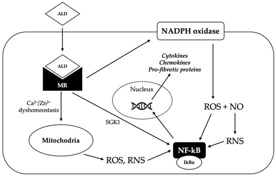 Potential mechanisms underlying the pro-oxidant effect of aldosterone. Aldosterone (ALD) diffuses through the plasma membrane to the cytosol, where it binds the mineralocorticoid receptor (MR), inducing its dimerization and activation. Activated MR promotes the generation of reactive oxygen species (ROS) via nicotinamide adenine dinucleotide phosphate (NADPH) oxidase; ROS react with nitric oxide (NO) to produce reactive nitrogen species (RNS). MR activation can also trigger the production of ROS and RNS in the mitochondria, probably by inducing Ca2+/Zn2+ dyshomeostasis. Increased ROS and RNS levels cause the release of nuclear factor kappa-light-chain-enhancer of activated B cells (NF-êB) from its repressor NF-êB inhibitor alpha (IkBá); NF-êB can therefore translocate in the nucleus, where it binds to a specific promoter and induces the transcription of pro-inflammatory and pro-fibrotic genes. Activated MR can also directly activate NF-êB, probably via the serum/glucocorticoid regulated kinase 1 (SGK1).