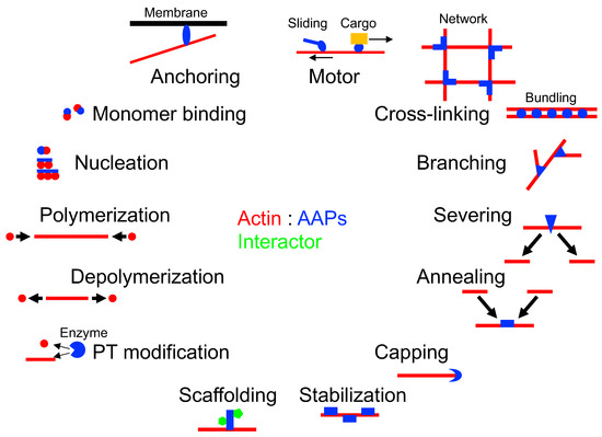 The functions of ABPs are often categorized by how they interact with actin and regulate its dynamics [2,10]. In this review, we have grouped them as shown in Figure 2 and indicated in Table S1.