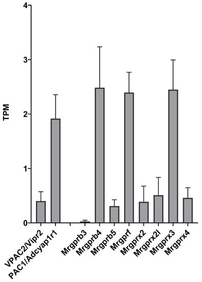 2.1. Expression of PAC1, VPAC2 and Mrgpr Receptor Transcripts in TG Cultures