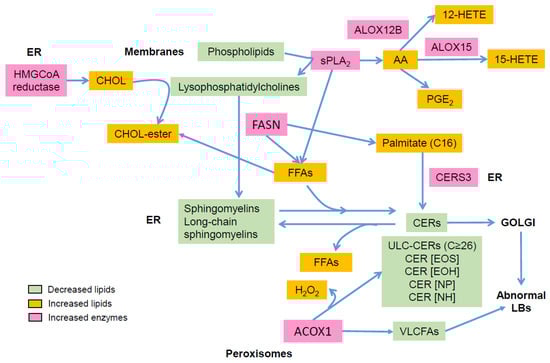 Main alterations in epidermal lipid composition in atopic dermatitis: AA: arachidonic acid; ACOX1: acyl-CoA oxidase; ALOX: lipoxygenase; CER: ceramide; CERS: ceramide synthase; CHOL, cholesterol; ER: endoplasmic reticulum; FASN: fatty acid synthase; FFA: free fatty acid; HETE: hydroxyeicosatetraenoic acid; LB: lamellar body; PG: prostaglandin; sPLA2: secretory phospholipase A2; VLCFA: very long chain fatty acid.