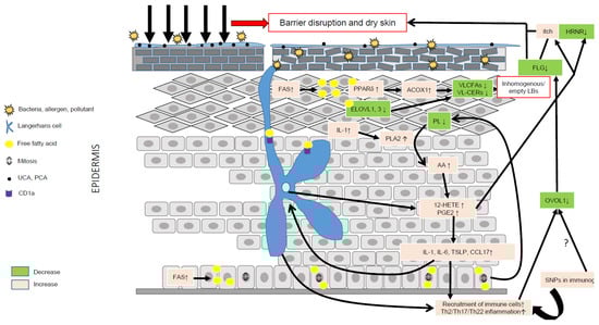 Exposure to pollutants, allergens, specific microbes and low ambient humidity might lead to impaired epidermal barrier and dry skin via profound and sustained modification of lipid metabolism in the epidermis (https://doi.org/10.3389/fenvs.2014.00011 (accessed on 9 February 2022)) [,,,], hence contributing to AD pathogenesis [,]. For example, low humidity steepens the gradient of water loss across the SC, thereby placing extra stress on an already flawed epidermis. Moreover, alterations of lipid availability in the AD skin microenvironment might play a role in the antimicrobial innate immune response and influence the fate of local skin dendritic cells (DCs) [].