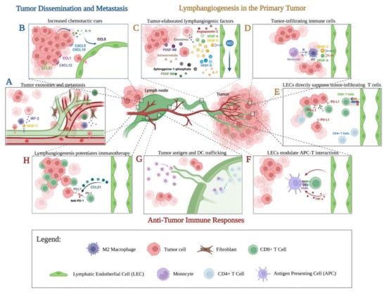 Despite a myriad of studies detailing the biological importance of angiogenesis in the tumor setting, the study of tumor lymphangiogenesis has lagged behind until about 2 decades ago, when the identification of lymphatic specific markers such as transcription factor Prox-1 and surface proteins LYVE-1, FLT4 (VEGFR3), and podoplanin accelerated our understanding of lymphatic biology both in the physiologic and pathologic settings [,]. Specifically, in the context of cancer, recent reports suggest that many of the physiologic functions of lymphatic vessels are co-opted by tumor cells for their own growth and metastasis [,,]. In the tumor microenvironment (TME), lymphatics undergo numerous changes including proliferation, elaboration of chemotactic molecules, and induction of immunomodulatory functions that influence tumorigenesis and metastasis []. In addition, the anatomy of lymphatic capillaries also promotes initial tumor dissemination given its permeable nature []. Evidence from several studies has established a link between lymphangiogenesis and metastasis, supporting the hypothesis that increased access to lymphatic capillaries raises the likelihood of tumor cell intravasation and metastasis []. Interestingly, lymphangiogenesis in premetastatic lymph nodes or distant sites promotes metastasis in these areas by establishing a “lymphovascular niche”, highlighting the fact that the tumorigenic effects of lymphatics extend beyond simply increased surface area for tumor cell invasion [,]. Tumor cells also hijack chemotactic gradients produced by LECs that aid in physiologic leukocyte homing to drive tumor cell migration []. In addition to the well-established roles of lymphatics in transporting fluid, macromolecules, and immune cells, recent studies have also shown that LECs can act as antigen-presenting cells at steady state and that this function can be co-opted by tumor cells to promote immune-evasion [,,,].