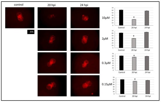 Evaluation of the effect of aphidicolin on reversible inhibition of DNA replication in porcine zygotes. In vitro derived zygotes were fixed and stained 20 h after insemination (20 hpi) after being cultured without aphidicolin (Control) and with different concentrations (0.15, 0.3, 2, and 10 µM) of aphidicolin. Half of them were washed and in vitro cultured without aphidicolin for 4 h, and then fixed (24 hpi). Images of zygote pronuclei stained with Click-iT™ EdU Alexa Fluor™ Imaging Kit assessed at 20 and 24 hpi are shown. Red fluorescence shows DNA after replication. Images were processed with Image J software (NIH) and relative fluorescence was assessed. Fluorescence intensity was relativized with respect to the pronucleus with the highest signal intensity. Comparison between the control group and zygotes 20 hpi and 4 h after removing aphidicolin (24 hpi) was performed. * Indicates significant differences with the other groups at a specific aphidicolin concentration (p < 0.05). Scale bar: 20 μm.