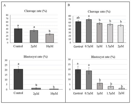 Effect of aphidicolin in porcine embryo development. (A) Cleavage and blastocyst rates for in vitro derived porcine embryos cultured with 0 (control), 2 and 10 µM aphidicolin. (B) Cleavage and blastocyst rate of in vitro derived porcine embryos cultured with 0 (control), 0.5, 1, 1.5, and 2 µM aphidicolin. Cleavage rate (%): Two-cell embryos per total number of inseminated oocytes. a,b Values with different superscripts are significantly different (p < 0.05).