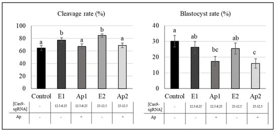 Effect of aphidicolin and ribonucleoprotein concentration in porcine embryo development. Figure shows cleavage and blastocyst rate of in vitro matured oocytes electroporated with 12.5 ng/µL Cas9 protein plus 6.25 ng/µL sgRNA and incubated without (E1) or with 0.5 μM aphidicolin (Ap1), electroporated with 25 ng/µL of Cas9 protein and 6.25 ng/µL of sgRNA and incubated without (E2) or with aphidicolin (Ap2), and Control group without electroporation or aphidicolin. Ap: aphidicolin; Cleavage rate (%): Two-cell embryos per total number of inseminated oocytes. a–c Values with different superscripts are significantly different (p < 0.05).