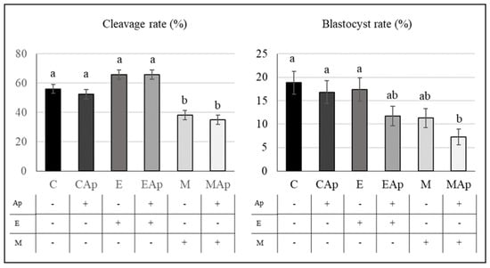 During embryo development (Figure 2D and Figure 6), the cleavage rate was not affected by the treatment with aphidicolin, however it was affected by the methodology used to deliver CRISPR/Cas9 (Table 3), being significantly lower in groups that were microinjected with respect to other groups (p < 0.01, Figure 6, Table 3). The blastocyst rate was similar in all groups except in groups microinjected with aphidicolin (MAp), where the blastocyst rate was lower (p < 0.01) than C, Ap, and E groups (Figure 6). In two-way ANOVA (Table 3), blastocyst rate was affected by both aphidicolin incubation (p = 0.03) and methodology (p < 0.01), being lower in groups treated with aphidicolin and in groups that were microinjected.