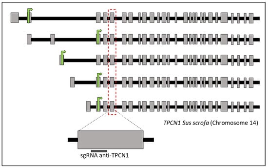 Single guide RNAs (sgRNAs) against TPCN1 (CATTCGGCACAAACGGACCA) were designed using Braking-Cas software [] (BioinfoGP, CNB-CSIC, Madrid, Spain). As shown in Figure 7, exon 9 is selected to edit all TPC1 isoforms described in the porcine genome. Both sgRNA and Cas9 protein were purchased from IDT (Integrated DNA Technologies, Leuven, Belgium).