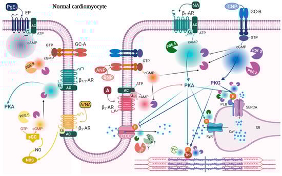 Intracellular signaling mediated by cyclic nucleotides (CNs) is organized in spatial-temporal nanodomains defined by localization and activities of receptors, adenylyl or guanylyl cyclases, protein kinases and PDEs, and this is defined as compartmentation. The first evidence for compartmentation of second messenger signaling in the heart was published in the 1970s and early 1980s for cAMP, where it was observed that isoproterenol (Iso) stimulation of β-ARs increased contractility, while stimulation with the prostaglandin PgE1 did not, despite both increasing cAMP [32,33,34]. It was shown that this difference was related to the intracellular location where cAMP was increased; Iso-stimulated cAMP pools were found in both the soluble and particulate fraction of cardiomyocyte homogenates, whereas cAMP from PgE1 was found only in the soluble fraction [35,36].