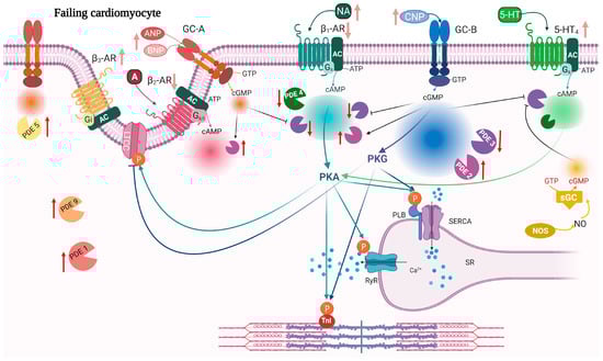 Remodeling and signaling alterations in heart failure. During HF, cardiomyocytes undergo structural remodeling which leads to alteration of the T-tubule structure, re-organization of the receptors and compartments. Red arrows indicate changes in expression of PDEs while light red arrows indicate changes in ligand and receptor expression in HF. 5-HT4 receptors are increased in HF and their stimulation induces a PIR and LR. Both GC-B and sGC stimulation increases cGMP that inhibits PDE3 activity towards 5-HT4-stimulated cAMP (light green). 5-HT4, 5-HT4 serotonin receptor; other abbreviations as in Figure 1. Created with BioRender.com.