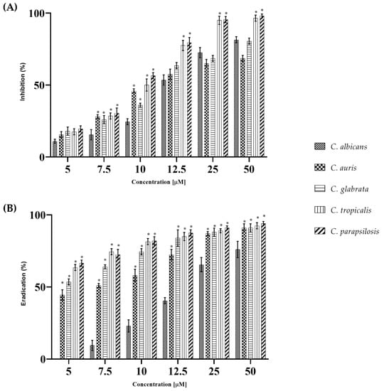 Dose-dependent biofilm inhibition by WMR (5.0; 7.5; 10.0; 12.5; 25.0; 50.0 μM) on C. albicans, C. auris, C. glabrata, C.tropicalis, and C. parapsilosis after 24 h in triplicate (Panel (A)). Dose-dependent biofilm eradication by WMR (5.0; 7.5; 10.0; 12.5; 25.0; 50.0 μM) on C. albicans, C. auris, C. glabrata, C.tropicalis and C. parapsilosis, in triplicate (Panel (B)). * represents significant differences vs. C. albicans (Holm–Sidak’s test).