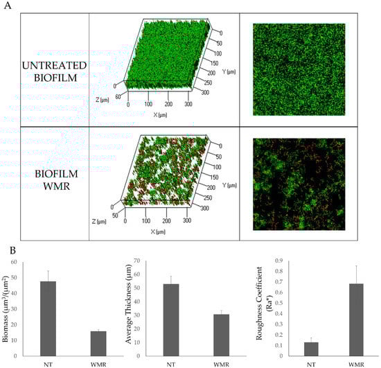 Analysis of the WMR effect on the C. parapsilosis biofilm structure. (A) CLSM analysis of biofilms formed in the presence (10.0 µM) and absence of WMR. Bi-dimensional and three-dimensional biofilm structures were obtained using the LIVE/DEAD® Biofilm Viability Kit. (B) COMSTAT quantitative analysis of biomass, average thickness and roughness coefficient of treated (WMR) and untreated (NT) biofilms.