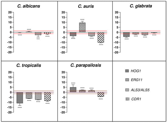 Finally, CDR1 showed a down-regulation in all Candida sp with exception of C. glabrata. The down-regulation in C. albicans was statistically significant compared to the expression changes in C. tropicalis (p < 0.0001) and C. auris (p < 0.0001), which in turn was statistically significant compared to C. glabrata, C. tropicalis and C. parapsilosis (p < 0.0001). Moreover, the expression levels showed in C. tropicalis were statistically significant compared to those described for C. glabrata (p < 0.0001) and C. parapsilosis (p < 0.05), which in turn were statistically significant compared to each other (p < 0.01; see Figure 3).
