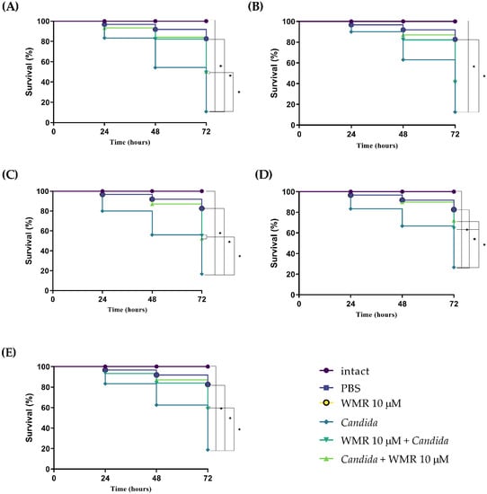 Kaplan–Meier plots of survival curves of G. mellonella larvae infected with C. albicans (A), C. auris (B), C. glabrata (C), C. tropicalis (D), C. parapsilosis (E). The concentration of Candida cells was 1 × 106 CFU/larva. Treatments consisted of phosphate buffered saline (Control), WMR alone (10.0 μM), WMR (10.0 μM) before or after infection; intact larvae (control). The data are the means of three independent experiments. * p < 0.05 (Dunnett’s test).