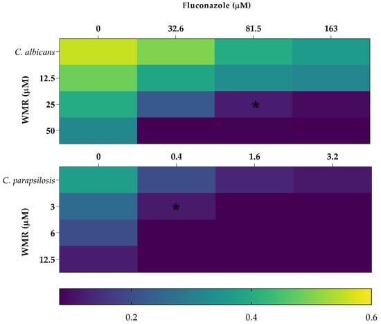 The combined activity of WMR and FLC against planktonic growth of C. albicans and C. parapsilosis. The color bar indicates relative OD growth. * indicates synergy (FICI ≤ 0.5).