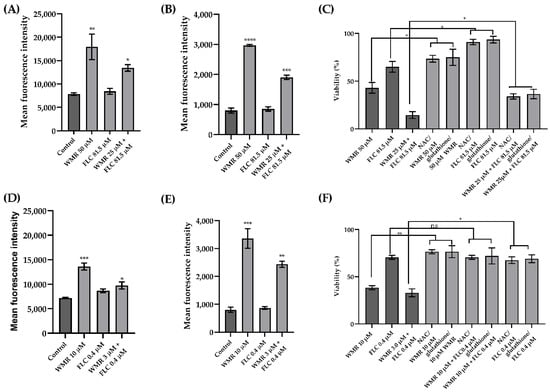 Induction of intracellular (A,D) and mitochondrial (B,E) ROS and cell rescue assay using ROS scavengers (C,F) on C. albicans (A–C) and C. parapsilosis (D–F). The viability was determined by counting CFUs after incubation with the agents and expressed as the percentage of survivals. ns = not significant, * = p < 0.05, ** = p < 0.01, *** = p < 0.001, **** = p < 0.0001 (Holm–Sidak’s test). FLC = fluconazole, NAC = N-acetyl cysteine.