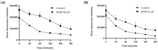 The effect of WMR on the efflux of Rh6 G in C. albicans (A) and C. parapsilosis (B). Mean fluorescence intensity represented the intracellular Rh6 G in fungal cells. Statistical significance was determined by Student’s t-test. * p < 0.05 when compared with the respective controls.