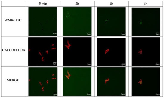 To investigate the molecular mechanism involved in WMR activity, the localization of the peptide was investigated by CLSM. C. parapsilosis cells were treated with WMR-FITC at different times and co-stained with Calcofluor white stain marking the bacterial wall with red colour (Figure 8).