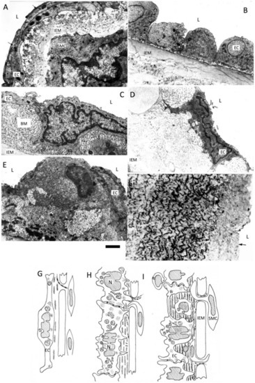 Accumulation of the basement membrane layers after multiple regeneration of endothelium. BM, basement membrane; L, Lumen of aorta; EC, endothelial cell; IEM, internal elastic membrane; SMC, smooth muscle cell. (A) Intima of the abdominal aorta in the normal rat; (B) Cross section of the abdominal rat aorta at the level of the regenerating endothelium cross sections of the spindle-like endothelial cells (EC) are shown; (C) Thick basement membrane (BM) is formed after several round of endothelial regeneration; (D) Thick basement membrane in old (24 years) rats; (E) Accumulation of extracellular matrix in the hypertensive rats (18 years old); (F) Semi-thin section of the intima (arrows) in the hypertensive rats (see E); (G–I) Scheme shows gradual accumulation of the multilayered basement membrane and migration smooth muscle cells (SMC) in the area of turbulent blood flow in rat aorta. Images (A–F) are from our archives of already published data. Images (G–I) are adapted from Mironov et al. [53]. Scale bar: 1.5 µm.