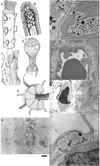 Lipid overloading of enterocytes induces the alteration of chylomicron formation and transport. (A,B,D,F,G) Schemes of enterocyte (A), where chylomicrons are formed, intestine villus (B), where chylomicrons are eliminated by lymph capillaries, lymph capillary (D), which absorbs chylomicrons, (F) intercellular contact in lymph capillary, lymph node (G). Chylomicrons pass through the lymph node; (C) Passage of normal chylomicrons (black dots) through the whole (white arrow) in the basement membrane; (E) Presence of chylomicrons (black and grey dots) in the interstitial space and their absence of the lumen (L) of blood capillary; (F) Accumulation of large chylomicrons (arrow) between enterocytes; (H) Accumulation of large chylomicrons (asterisk) in the interstitial space and in the lumen (L) of lymph capillary; (G) Giant chylomicrons (asterisks) below endothelial cell of the lymph lumen (L). The chylomicron cannot enter the lumen of the lymph capillary. Images (E,F,H,I) are from our archives of already published data. Image (A) is adapted from Sesorova et al. [60]. Image (F) is adapted from Sesorova et al. [61]. Scale bars: 150 nm (C); 1 µm (E,F,H,I).
