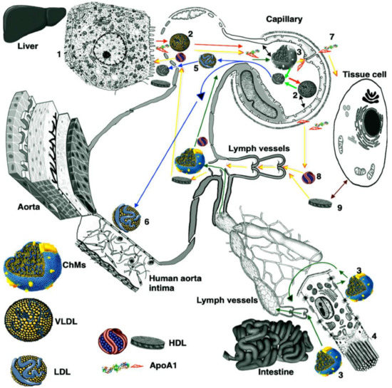 Hepatocyte (1) synthesizes VLDL (2), which moves into the blood through pores in the endothelial cells of the liver sinusoid (red arrows). Next, VLDL arrives at the blood capillary with continuous endothelium and gives cholesterol to the APM of ECs. Unfolded ApoA1 is synthesized by hepatocytes and also arrives at this capillary (yellow arrows). It passes the endothelium through intercellular contacts and appears in the interstitial space. There, it contacts with the BLPM of ECs and takes cholesterol there, forming HDL. ChM (3) is formed by enterocytes (4). It is transported to the interstitial space and then to the lumen of lymph capillary and delivered to the blood capillary lined with the continuous endothelium (dark green arrows). In the capillary, VLDL and ChM contact with the APM (black double-sided arrows) and insert cholesterol and fatty acids into it. After this, ChM and VLDL are transformed into LDL (5, 6), which are delivered to hepatocytes passing through pores in sinusoidal endothelium. Finally, LDLs are taken by LDL receptors on the PM of hepatocytes. Part of LDL contacts with ECs, lining the aorta in the areas of high hemodynamic stress and can pass into the intima there through leaky contacts (7). Apo1 passes the endothelium through intercellular contacts and appears inside the interstitial space. It contacts with the baso-lateral PM of ECs and takes cholesterol and fatty acids from it. Then, ApoA1 is transformed into HDL of two types (8, 9). Next, it interacts with the PM of tissue cell and takes cholesterol when it is necessary. After this, HDLs are absorbed by lymph capillaries and delivered to the blood (yellow arrows). Finally, HDLs pass through pores of sinusoidal endothelium and reach scavenger receptors of the PM of hepatocytes. Abbreviations: APM, apical PM; ChM, chylomicron; HDL, high-density lipoprotein; LDL, low-density lipoproteins; PM, plasma membrane; VLDL, very LDL. Image (3) is adapted from Mironov et al. [53].
