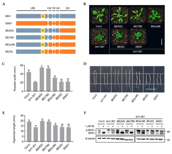 Our previous study uncovered that the intracellular domains of EMS1 can substitute the intracellular domains of BRI1 to maintain the typical receptor function []. However, it remained unclear whether the subdomain outside of the EMS1 kinase domain could replace the corresponding BRI1 domain. In order to seek the structural subunits in EMS1 that can replace BRI1, we divided the functional domains of BRI1 and EMS1 based on the mentioned structural features. Using the domain swapping method, we generated several chimeric receptors by fusing BRI1 and EMS1, including BE(KD), BE(TM), BE(eJM), and BE(ID) (Figure 1A). BE(KD), consisting of BRI1 extracellular domain, transmembrane domain, and intracellular juxtamembrane domain fused to the kinase domain of EMS1. BE(TM) with BRI1 extracellular and transmembrane domains fused to the intracellular juxtamembrane and kinase domain of EMS1. BE(eJM), the chimeras with BE(TM) in the absence of BRI1 extracellular juxtamembrane domain. BE(ID), the chimeras with BE(eJM) in the absence of BRI1 ID adjacent LRR domain (Figure 1A). We transformed these chimeric receptors into a weak BRI1 mutant bri1-301. The results showed that BE(KD) and BE(TM) were able to completely rescue the phenotype of bri1-301 (Figure 1B,C), and that the BE(eJM) partially restored bri1-301 phenotype, whereas the BE(ID) failed to repress the phenotype of bri1-301 (Figure 1B,C). The hypocotyl length of the seedling in the dark can be used as an indicator of the strength of the endogenous BR signal []. We observed that BE(KD) and BE(TM) completely recovered the defective hypocotyl elongation of seedling grown in the dark (Figure 1B–E). The hypocotyl was longer in the BE(eJM) transgenic plants than bri1-301, but not as long as in the BE(KD), BE(TM), and wild-type, which was consistent with the rosette leaves phenotype (Figure 1B–E). To further assess the restoration of the chimeric gene in bri1-301, we used semi-quantitative PCR to analyze the expression of BR biosynthetic genes CPD and DWF4 or BR catabolic gene BAS1 in the transgenic plants []. We found that the expression of CPD and DWF4 was dramatically down-regulated and that of BAS1 was up-regulated in BE(KD)/bri1-301 and BE(TM)/bri1-301 compared with bri1-301 mutant. The transcription levels of CPD, DWF4, and BAS1 in BE(eJM)/bri1-301 were slightly regulated in comparison with bri1-301, whereas BE(ID) and EMS1 did not have an effect on gene expression (Figure S1B).