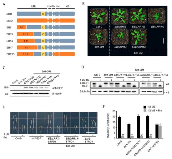 The first three LRRs of EMS1 were sufficient for interacting with TPD1 to activate EMS1-TPD1 signaling []. We then tested whether the receptors EB(LRR7) and EB(LRR13) that contain the first three LRRs of EMS1 have a dual function of binding to both TPD1 and BR. Our previous study showed that the co-expression of EMS1&TPD1 repressed the bri1 mutant, but made it insensitive to Brz (Brassinozole, BR synthesis inhibitors), which can be used as a strong indicator to test the TPD receptor function []. In order to verify this hypothesis, we applied Brz to the EB(LRR7)&TPD1/bri1-301, EB(LRR13)&TPD1/bri1-301, and EMS1&TPD1/bri1-301 co-expression transgenic plants, with EMS1&TPD1/bri1-301 used as a positive control (Figure 2E,F). We found that EB(LRR7)&TPD1/bri1-301 and EB(LRR13)&TPD1/bri1-301 were sensitive to Brz. When treated with Brz, the hypocotyl elongation of EB(LRR7)&TPD1/bri1-301 and EB(LRR13)&TPD1/bri1-301 was suppressed (Figure 2E,F). These results suggest that the 1-13 LRR domain of EMS1 is not sufficient for the TPD1 receptor function when fused with BRI1.
